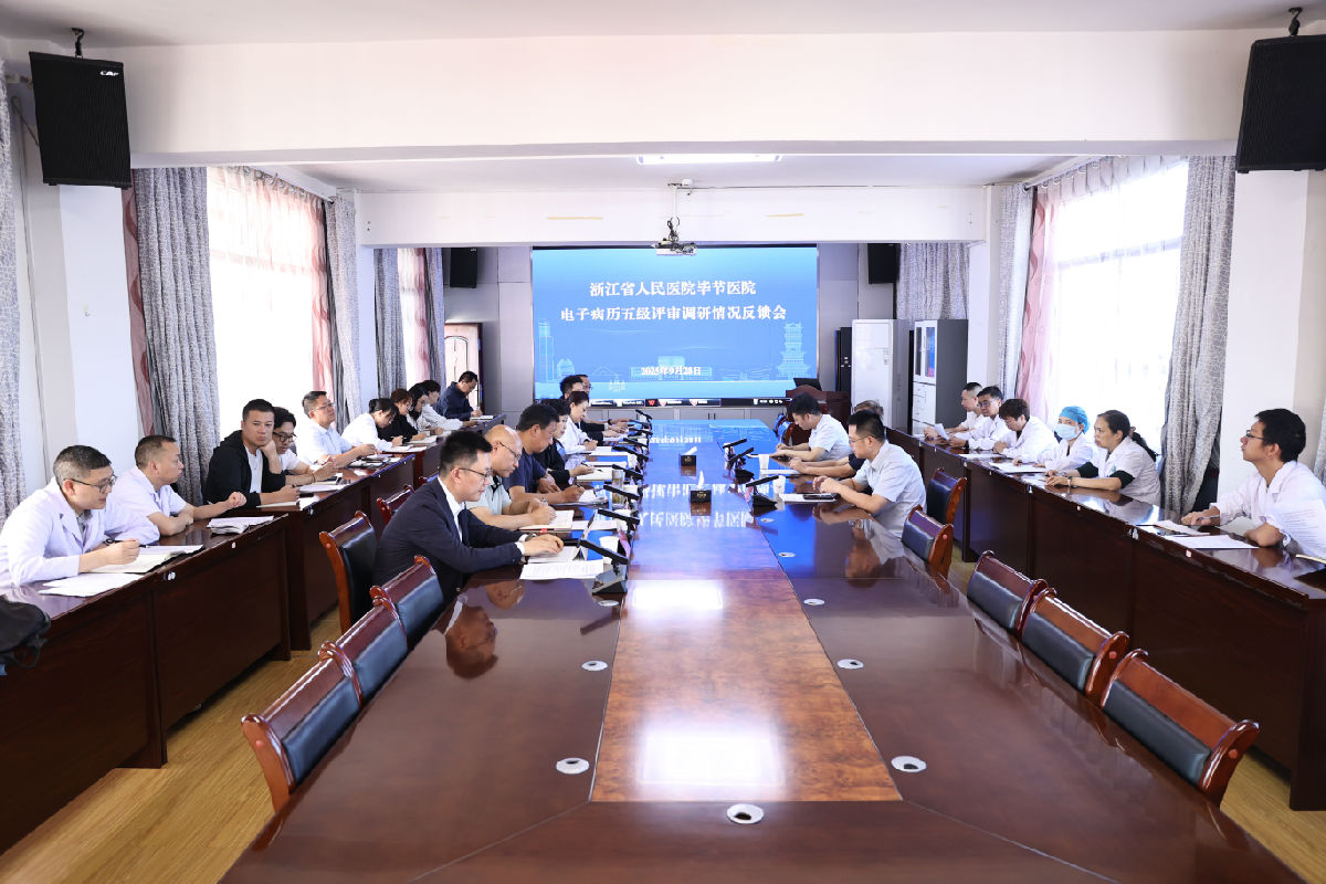 浙江省人民医院(以下简称“总院”)信息化与人工智能部副主任范玉林、信息中心原主任郎义青、信息化与人工智能部主任助理李翔杰应邀到浙毕医院现场“问诊把脉”并作指导。浙毕医院党委书记吴国春在反馈会上作总结讲话。党委副书记陈勇在调研会上作工作安排并出席反馈会。党委委员、纪委书记王敖,副院长吕贵荣,党委委员、副院长黄治平出席反馈会。副院长陈晓晨在调研会上致辞并主持反馈会。信息科负责人主持调研会。中国联合网络通信有限公司毕节市分公司、浙江和仁科技有限公司相关负责人,浙毕医院行政职能科室、临床、医技相关科室负责人参加。