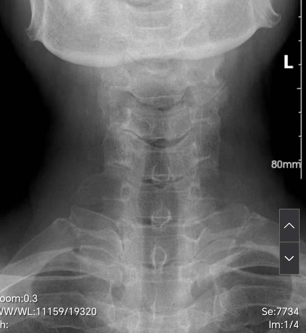来自赫章县的61岁女性患者,因右上肢前臂持续性放射性疼痛、麻木到浙毕医院就诊。经完善相关检查,患者影像学检查明确:颈5/6、颈6/7椎间盘突出伴钩锥关节重度增生,脊髓受压并出现T2加权像高信号改变,神经功能已濒临不可逆损伤;其中颈5/6节段钩锥关节骨赘直接压迫右侧神经根,是症状的核心诱因。