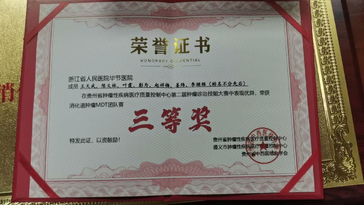 11月21日—22日,由贵州省肿瘤疾病医疗质量控制中心举办的第二届全省肿瘤性疾病诊治技能大赛在遵义市举行。浙江省人民医院毕节医院(毕节市第一人民医院)(以下简称“浙毕医院”)选派的“北斗七星”队和“寻踪者联盟”队,分别荣获“消化道肿瘤MDT团体组”及“头颈肿瘤MDT团体组”三等奖。