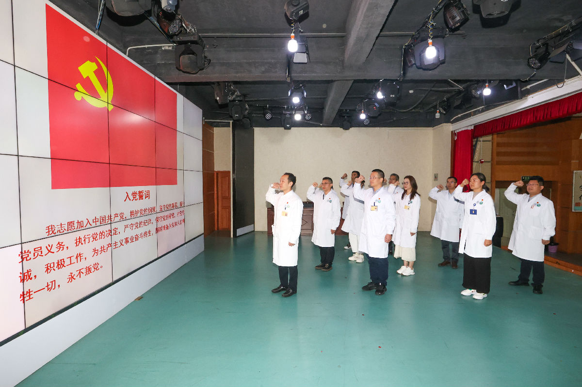 在张骏的带领下,学习小组成员面对鲜红的党旗,高举右拳,重温入党誓词。铿锵有力的誓言回荡在会场,表达了大家坚守初心、担当使命,为医疗卫生事业不懈奋斗的坚定信念。